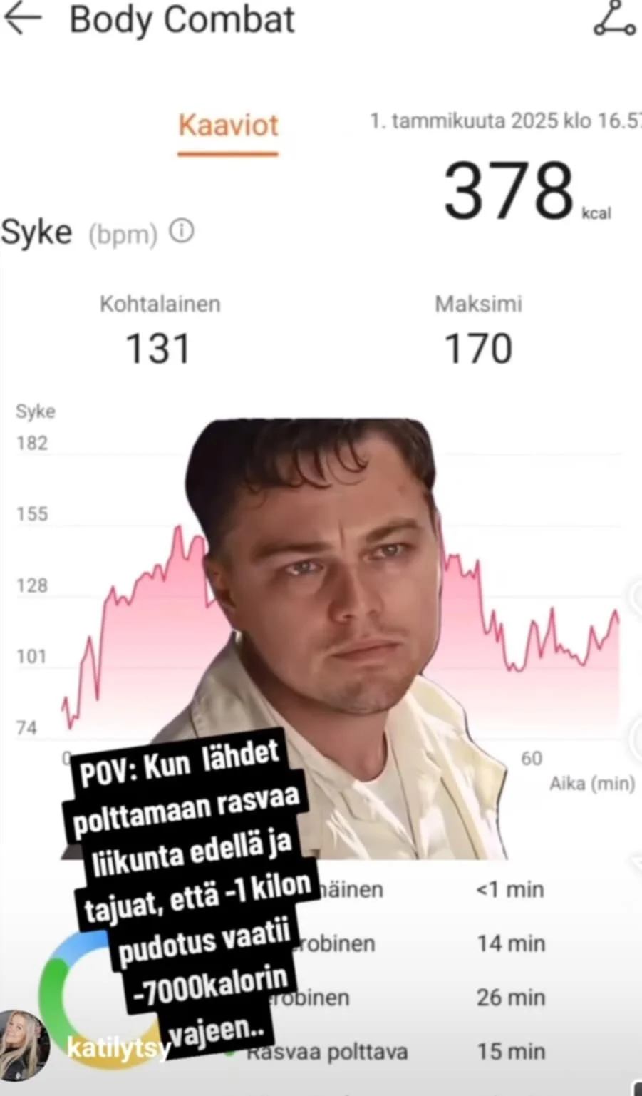 “Nyt olen ansainnut kyllä tämän ruuan, kun kävin treenaamassa.” Kuulostaako tutulta? Saatamme yliarvioida liikunnan aikana poltetut kalorit ja myös lisääntynyt liikunta voi helposti myös lisätä ruokahalua. Huomaamattaan voi siis syödä enemmän kuin ennen. Siksi myös liikunta edellä ei kannata pudottaa painoa, koska pitäisi liikkua ihan älyttömästi, jotta saisimme vajetta aikaiseksi. Ylirasitus ja liikuntavammat tulevat helposti tässä tilanteessa. Energiavaje kannattaa hakea siksi ruuasta ei liikunnasta.